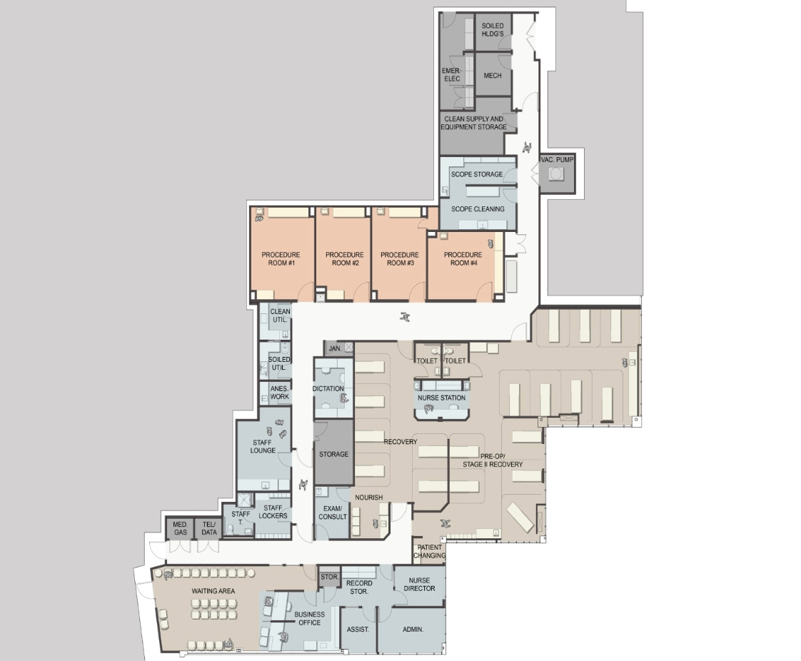 HSA designed this endoscopy center fit-out located on the ground floor of a medical office building for Atrius Health. It was designed, at the time, for conversion to an ambulatory surgery center in the future, and involved an addition to the existing shell building.